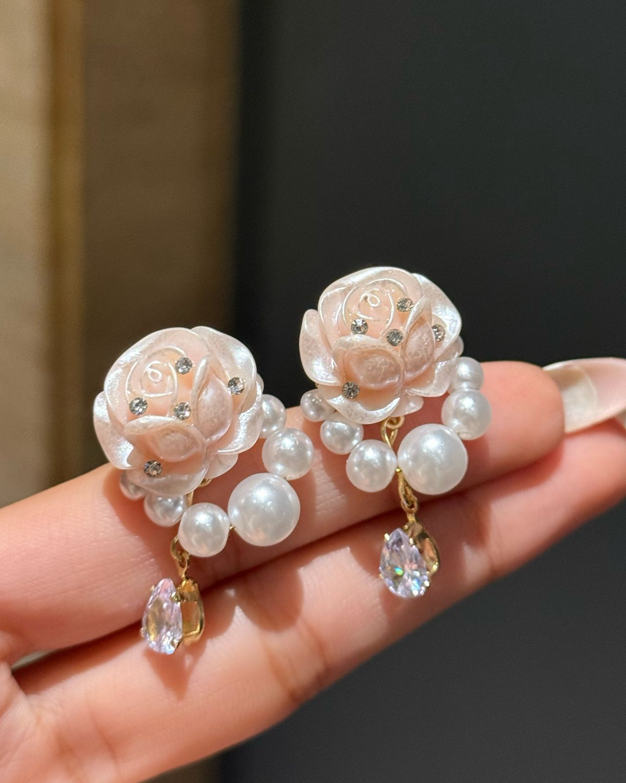 Flower earrings, party earrings, Korean earrings collection , pink rose earrings, pearl earrings, wedding earrings, girly girl earrings, glam earrings collection, dreamy earrings, pink earrings, birthday jewellery, dreamy jewellery, handmade earrings, Princess earrings.