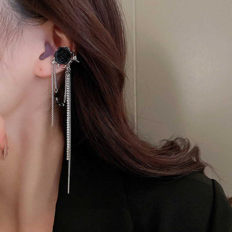Black earcuff, rose earcuff, dangling earcuff, big earrings, silver earcuff, grunge earcuff, grunge accessories, gifts for girls