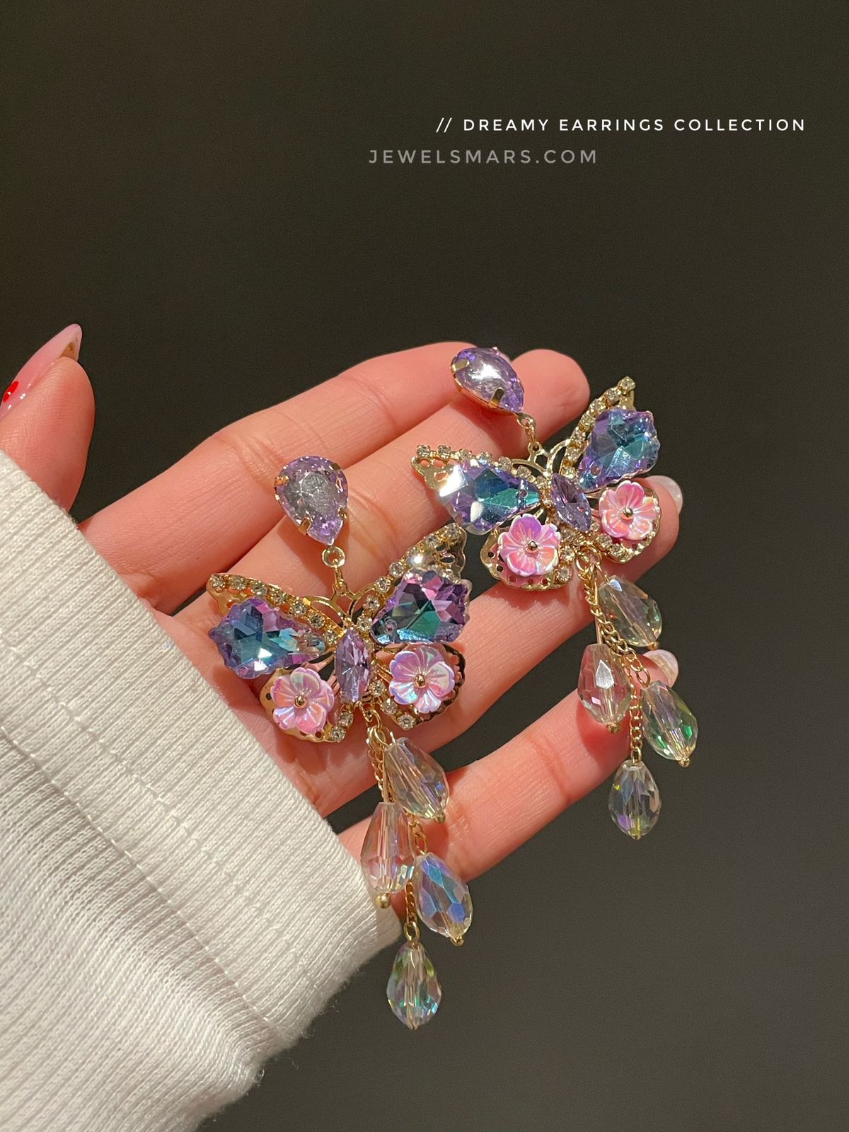 Golden earrings, party earrings, Korean earrings collection , girly girl earrings, glam earrings collection, dreamy earrings, blue earrings, purple earrings, pink earrings, floral earrings, flower earrings, butterfly earrings, crystal earrings, pearl earrings, dreamy jewellery, handmade earrings.