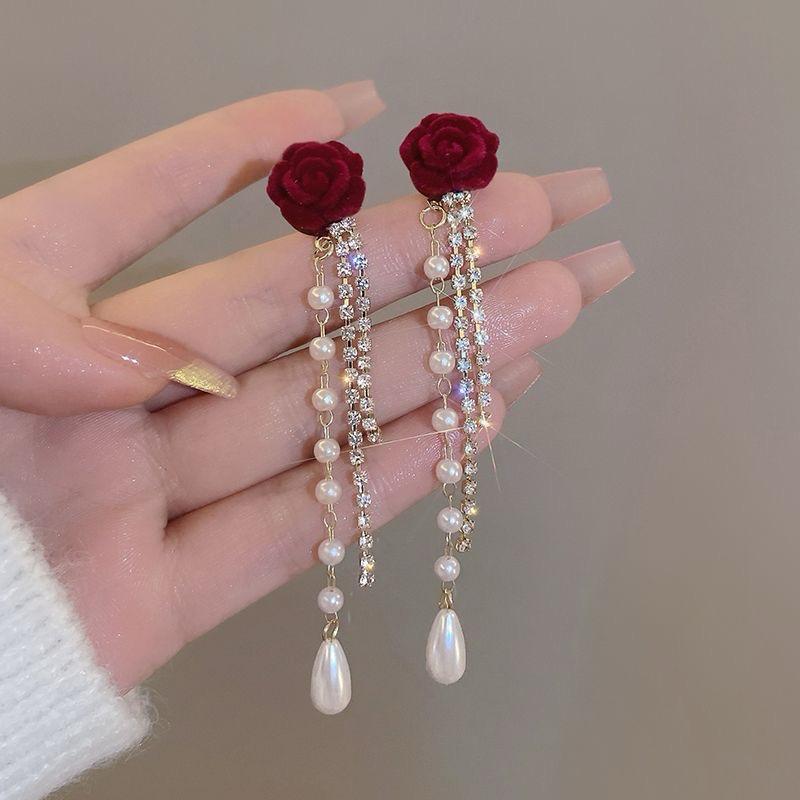 Korean earrings, cute jewellery , soft girl aesthetic, campus collection, red rose earrings, cute earrings, pearl earrings