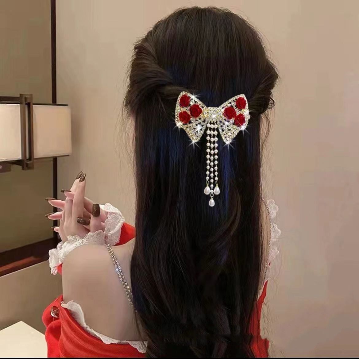 perfect for party looks, hair accessories, hair claws , classy hair accessories , rose hair claws, red hair claws, bow accessories, floral claws, pearl hair claws, party glam accessories.