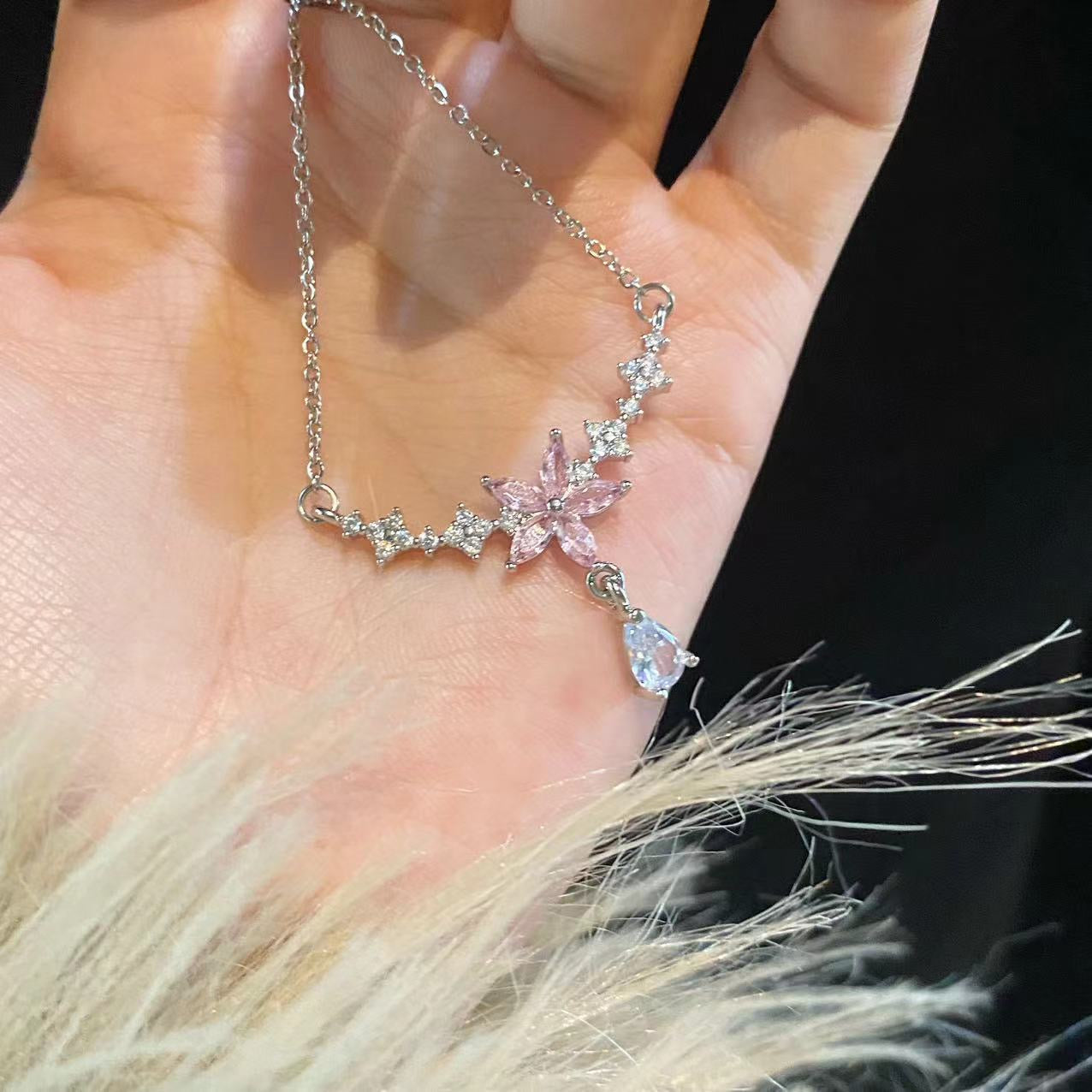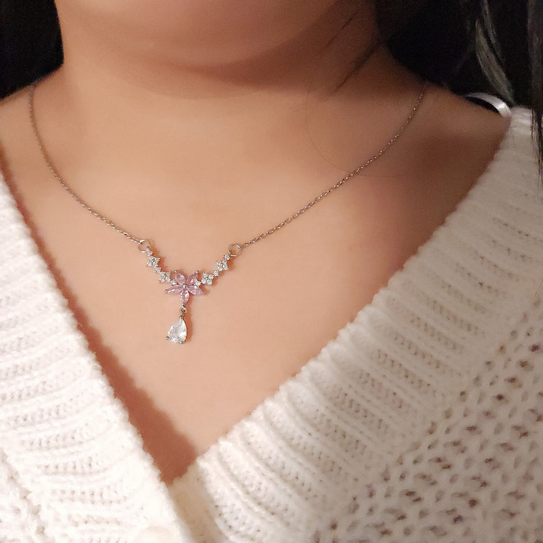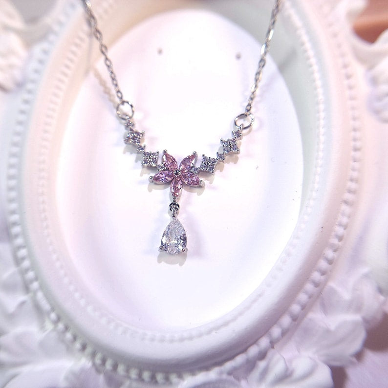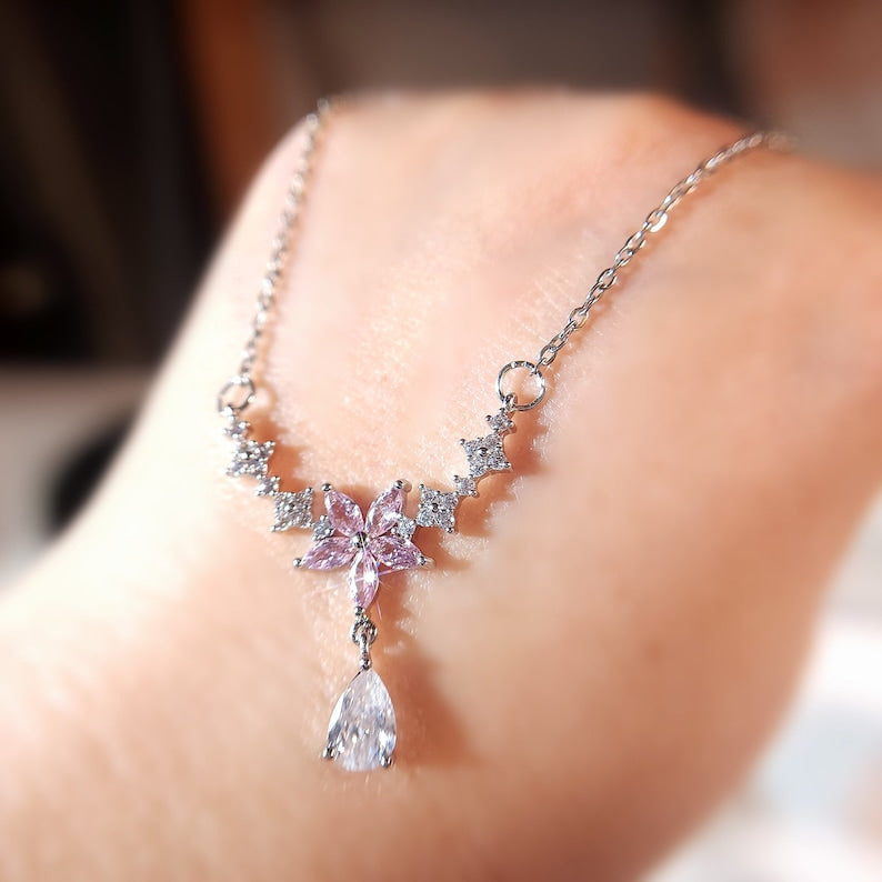 stainless steel necklace , silver necklace, anti tarnish necklace, anti tarnish jewellery, princess necklace, pink flower necklace, floral jewellery.