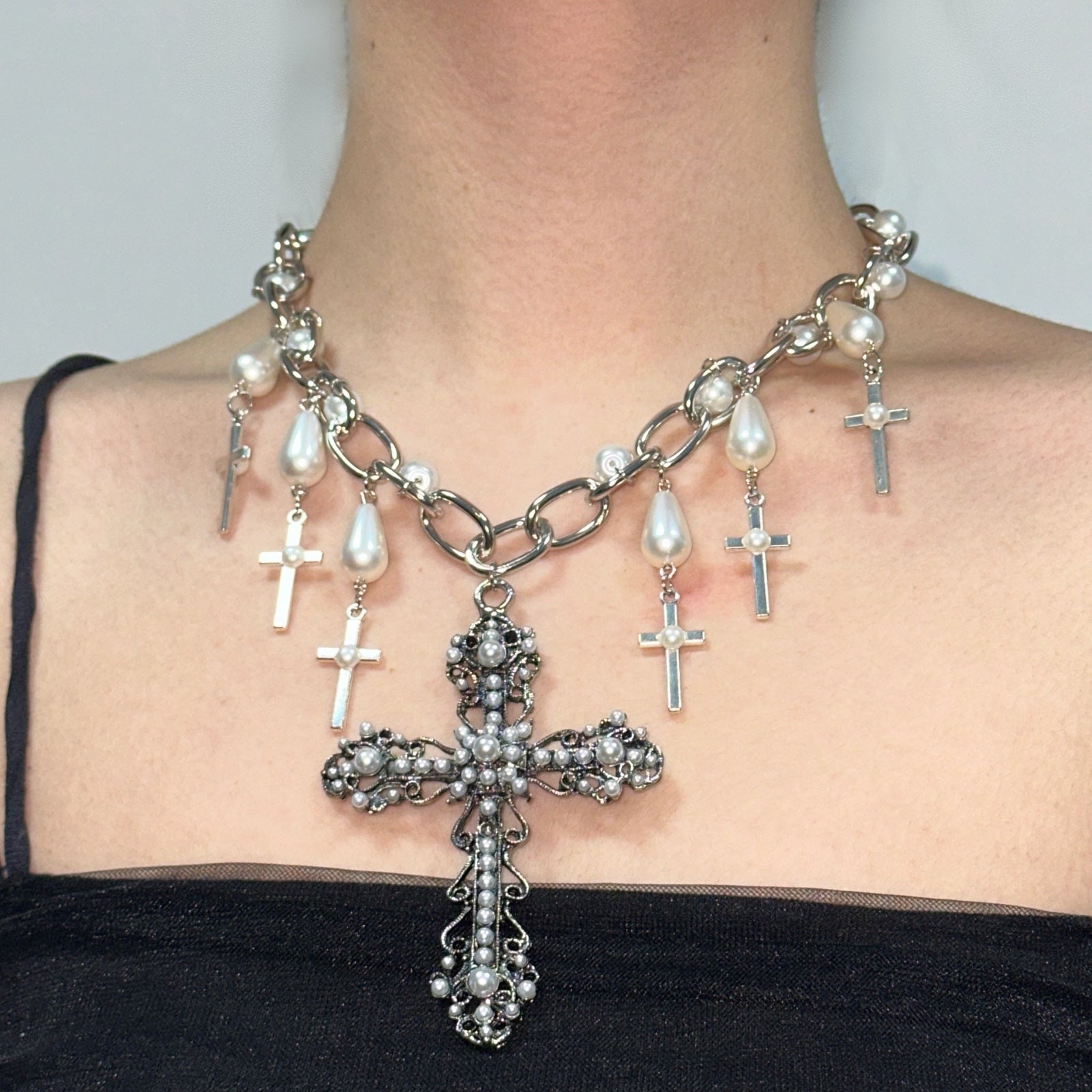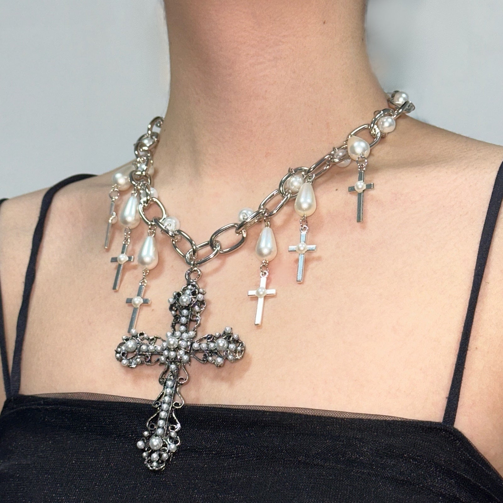 White Necklace, pearl Necklace, Silver Jewellery, cross necklace, Pinteresty necklace, grunge Necklace, grunge aesthetic Jewellery, Silver Necklace
