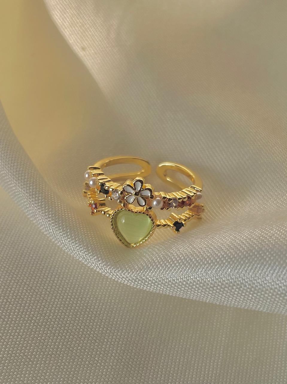Heart ring, minimal ring, soft girl aesthetic, gift for her, green ring, white flower ring, pearl ring.