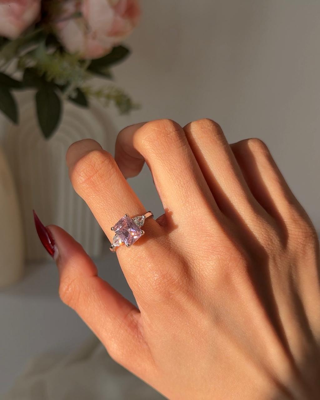 Square ring, silver ring, pink ring, rhinestone ring, dreamy jewelery, gifts for girls