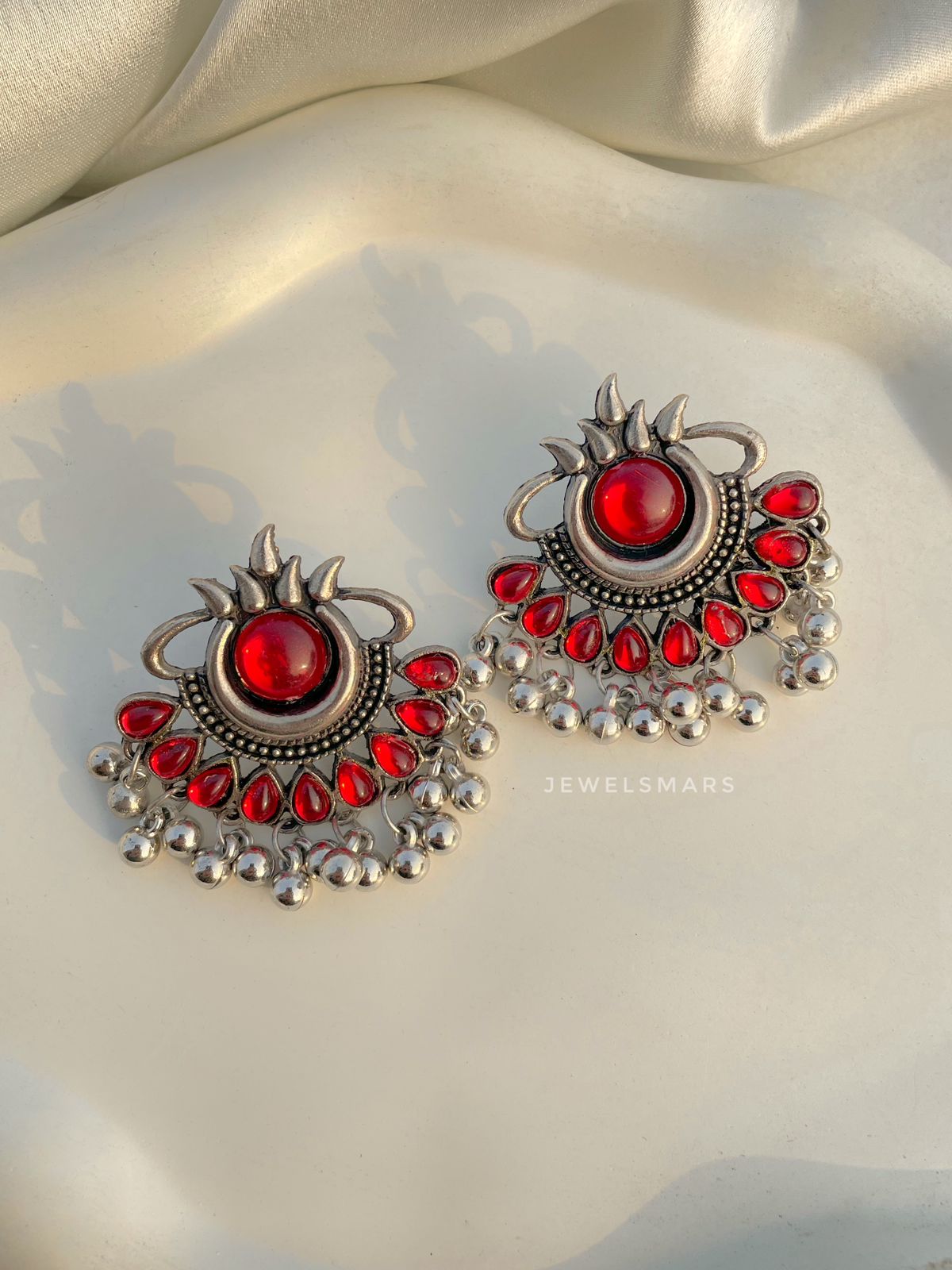 oxidised jewellery , silver earrings, stud earrings, red earrings, ethnic collection , oxidised studs, everyday wear jewellery, office wear earrings.