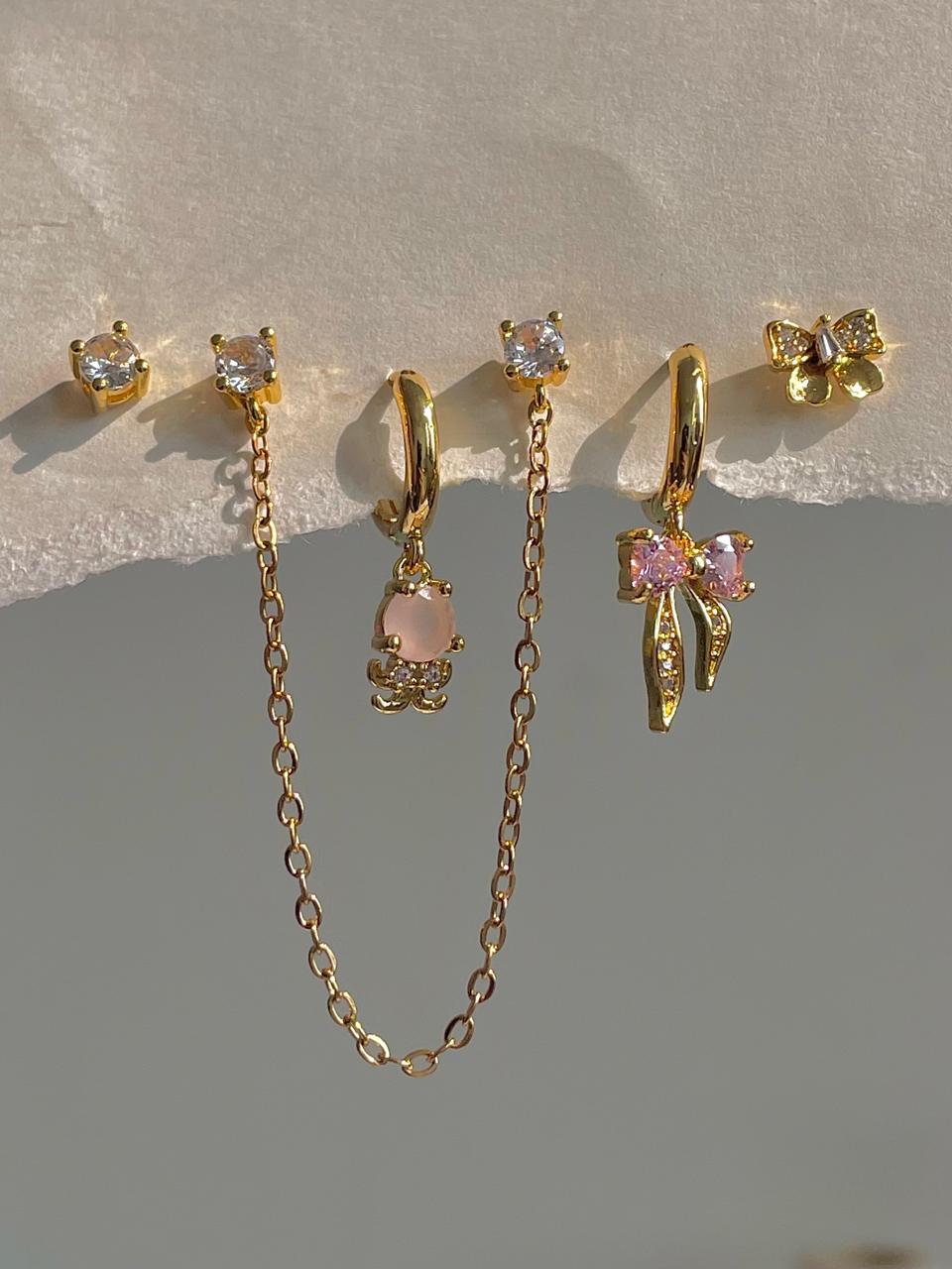 Pink earrings, earrings combo, bow earrings, chain earrings, multiple piercings, earrings set, gold plated earrings, anti tarnish earrings