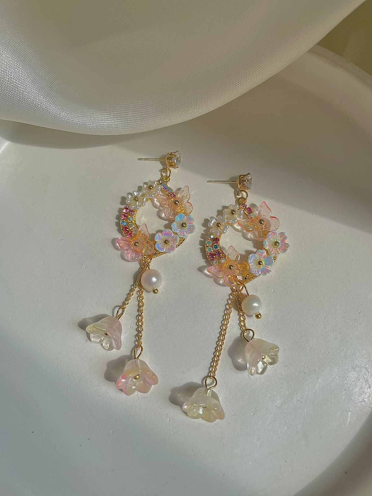 Golden earrings, party earrings, Korean earrings collection , girly girl earrings, glam earrings collection, dreamy earrings, floral earrings, flower earrings, crystal earrings, pearl earrings, dreamy jewellery, handmade earrings, Princess earrings,