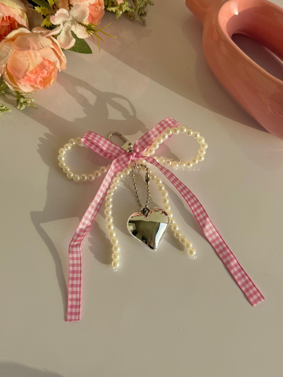 Trending accessories, pearl bow bag charm, pink bag charm, pearl bag charm, silver bag charm, bag accessories, key chains, heart bag charm, bow keychain.