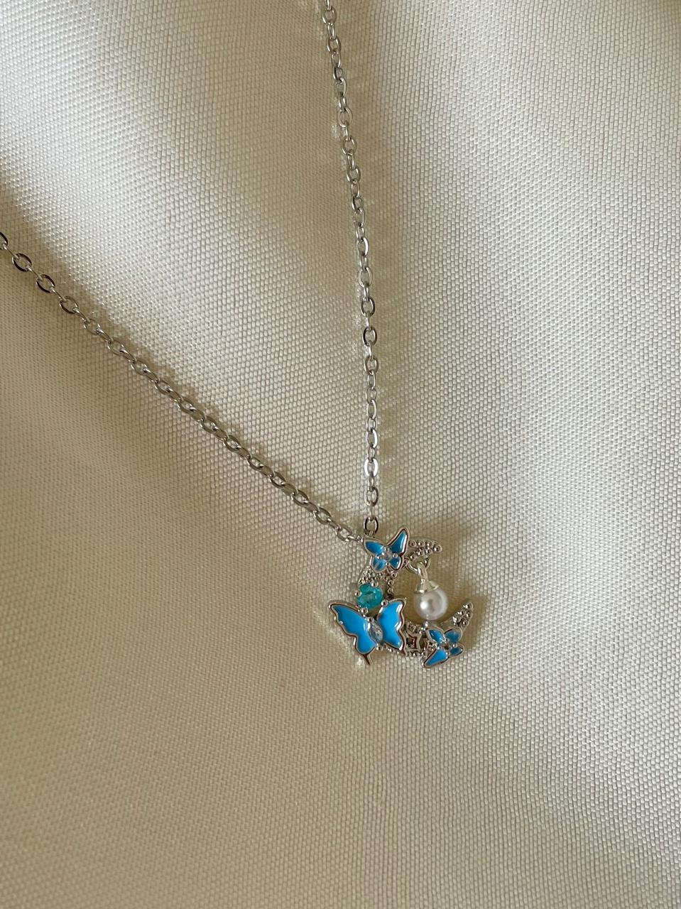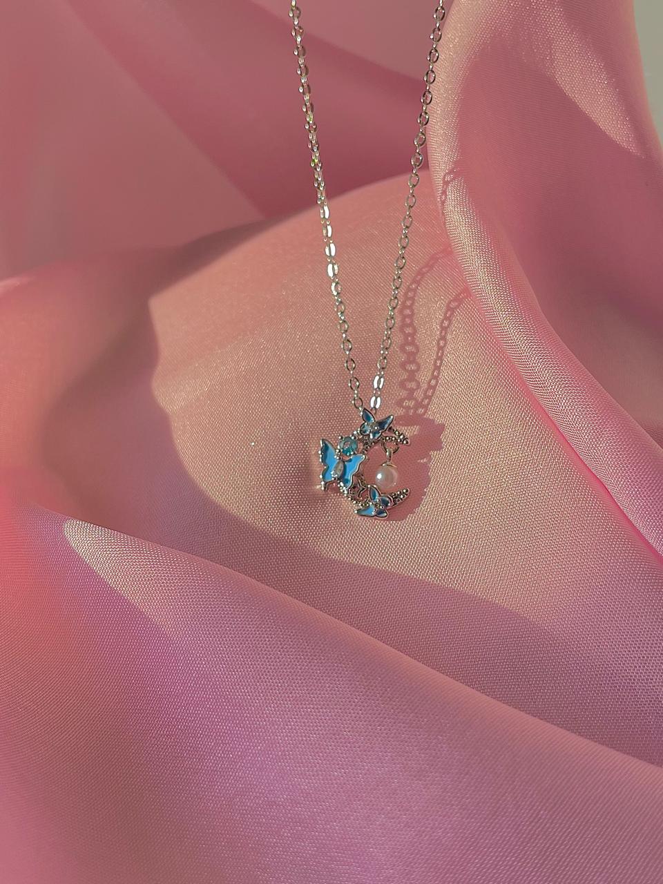 stainless steel necklace , silver necklace, anti tarnish necklace, anti tarnish jewellery, blue butterfly necklace, blue necklace, pearl necklace, moon necklace, butterfly necklace, moon jewellery.