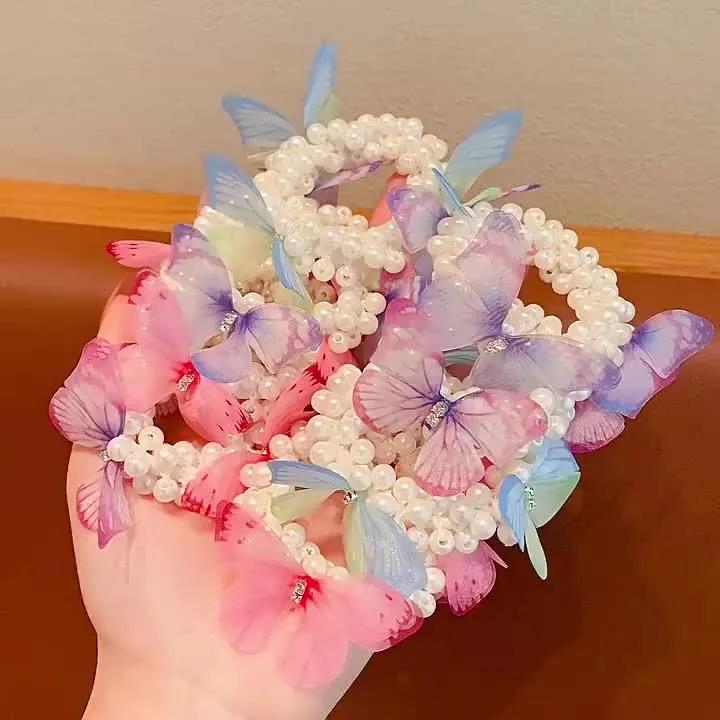 hair tie, hair accessory , butterfly hair accessory, pink butterfly hairtie, purple butterfly hairtie, pearl scrunchie, pearl rubber band