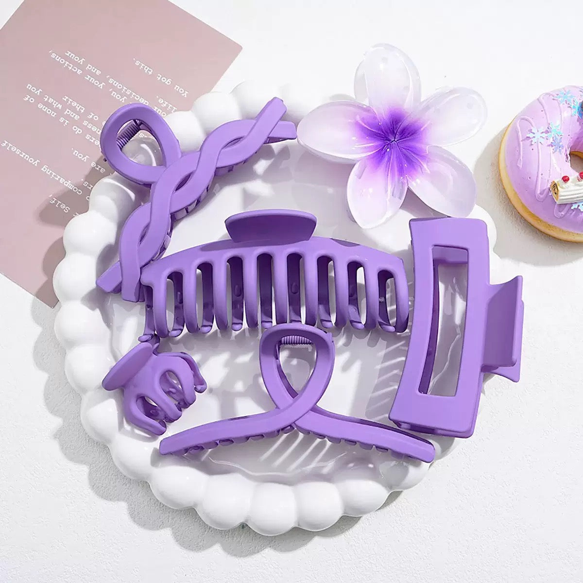 Purple hair accessories, claw clips combo, pinteresty hair combo, white claw clips, flower claw clip, lilac claw clip